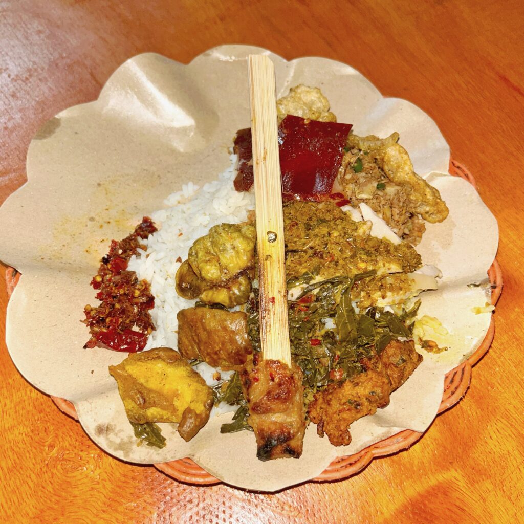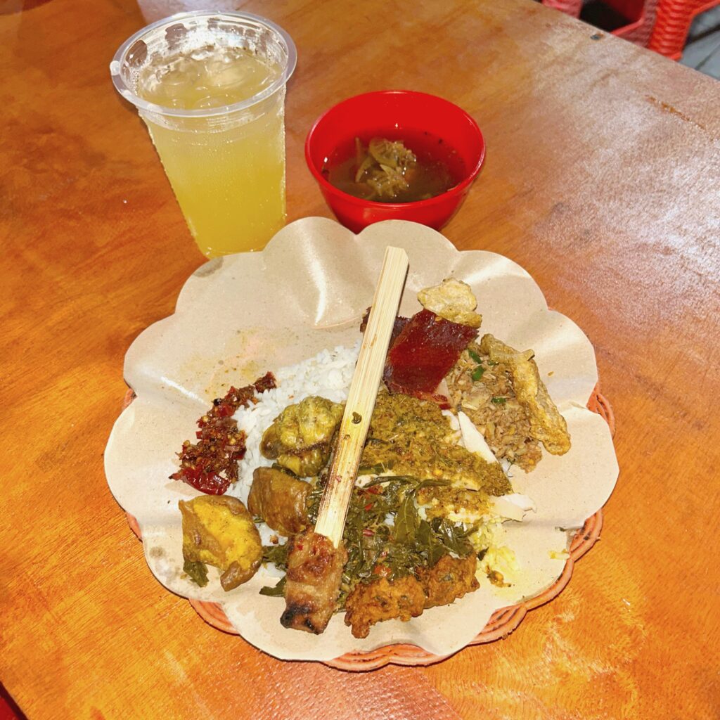 - Nasi Babi Guling 25k (Campur) : Satu porsi nasi babi guling dengan porsi besar dan isian super lengkap. Dalam satu piring sudah dapet be genyol yang lembut, kulit babi crispy, sate babi, gorengan, lawar khas Bali, sayur, muluk merah, kerupuk rambak, lengkap dengan sambel terasi yang pedas gurih. Disiram kuah gurih dengan bumbu genep yang medok dan berasa banget, bikin tiap suapan nagih dan puas. Dengan harga 25 ribu, ini tipe nasi campur yang kenyang, rame, dan worth it.