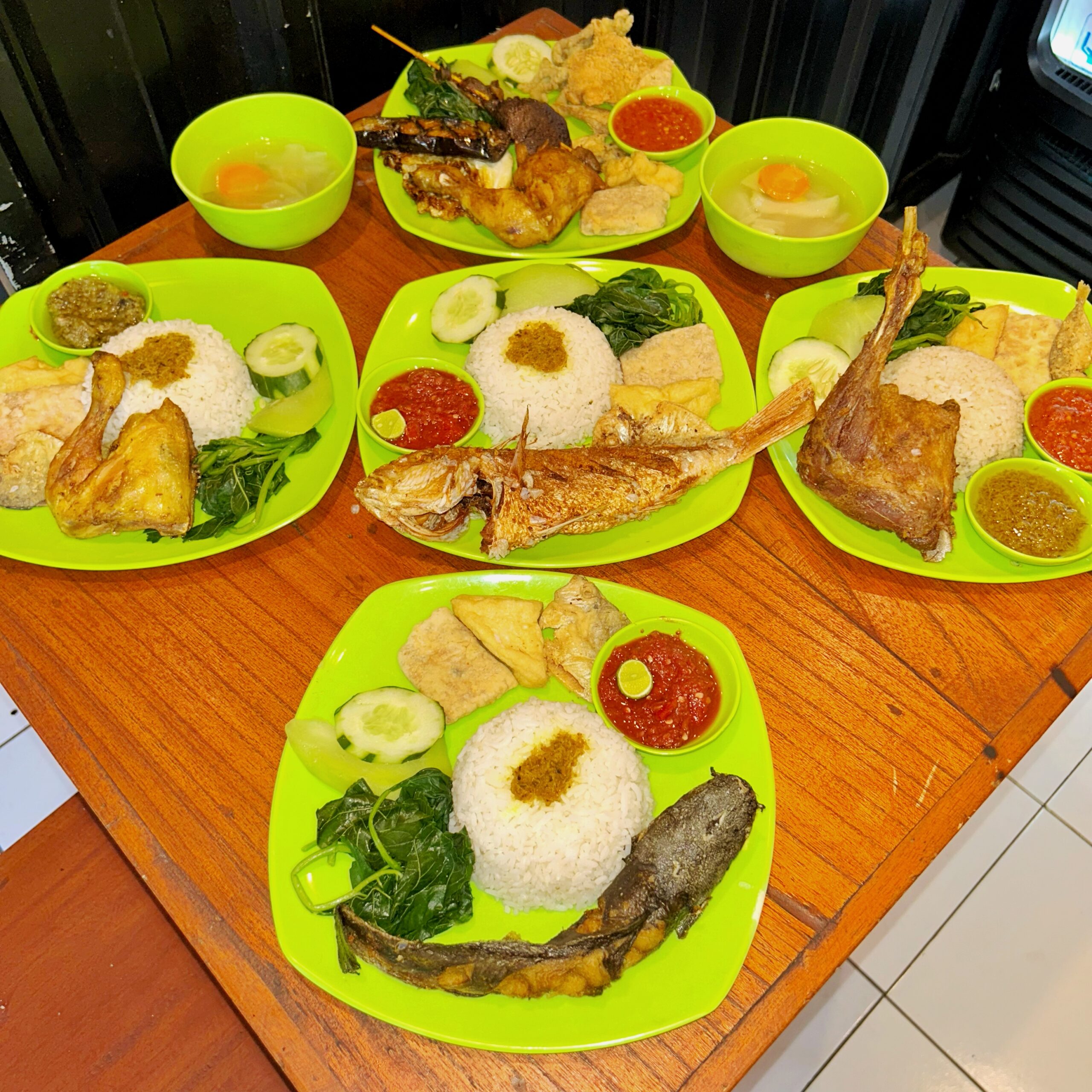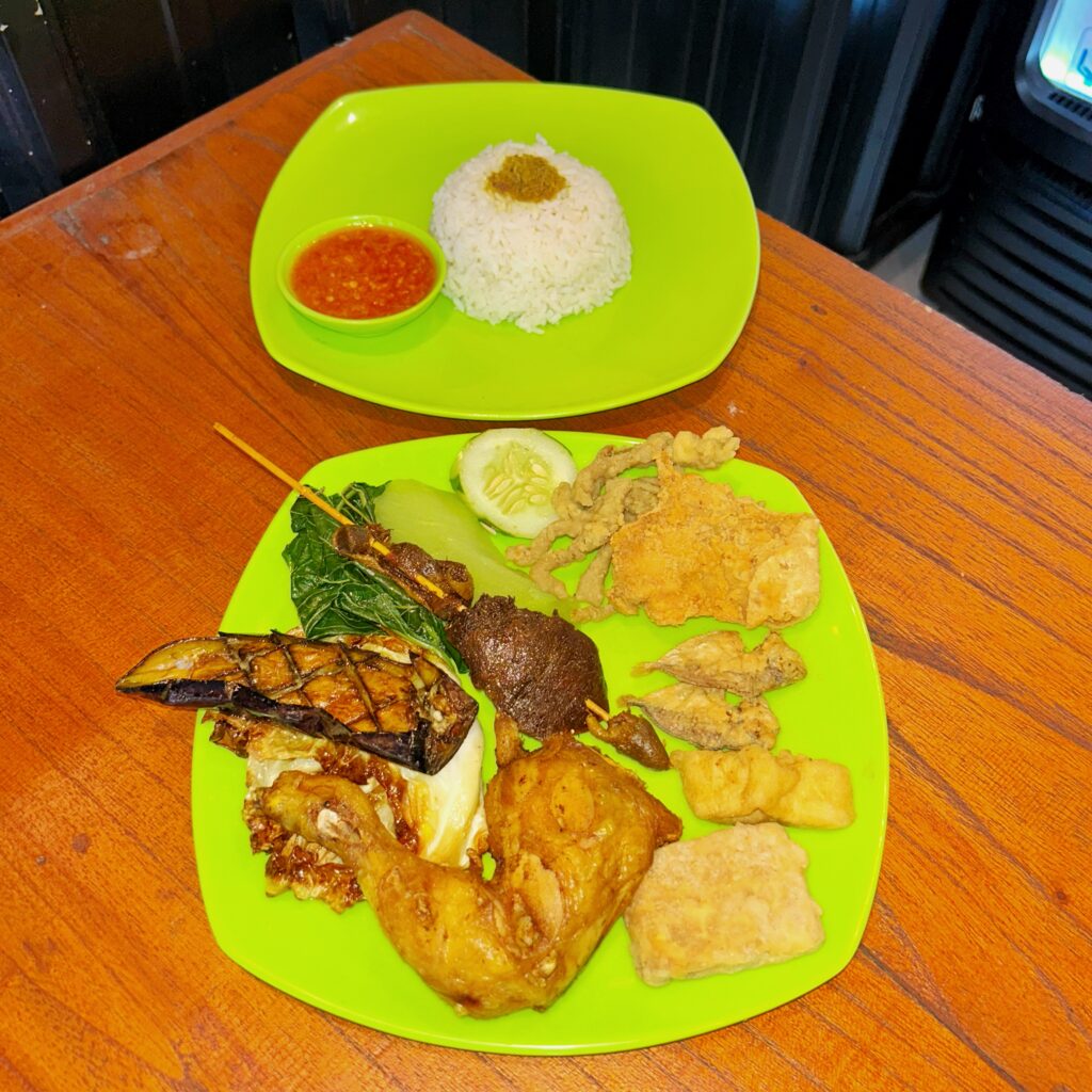 - Nasi Tempong Ayam Komplit – Rp35.000 : Nasi, ayam, hati ampela, kulit, usus, sayuran, tempe, tahu, ikan asin, sambal matang. Super lengkap!