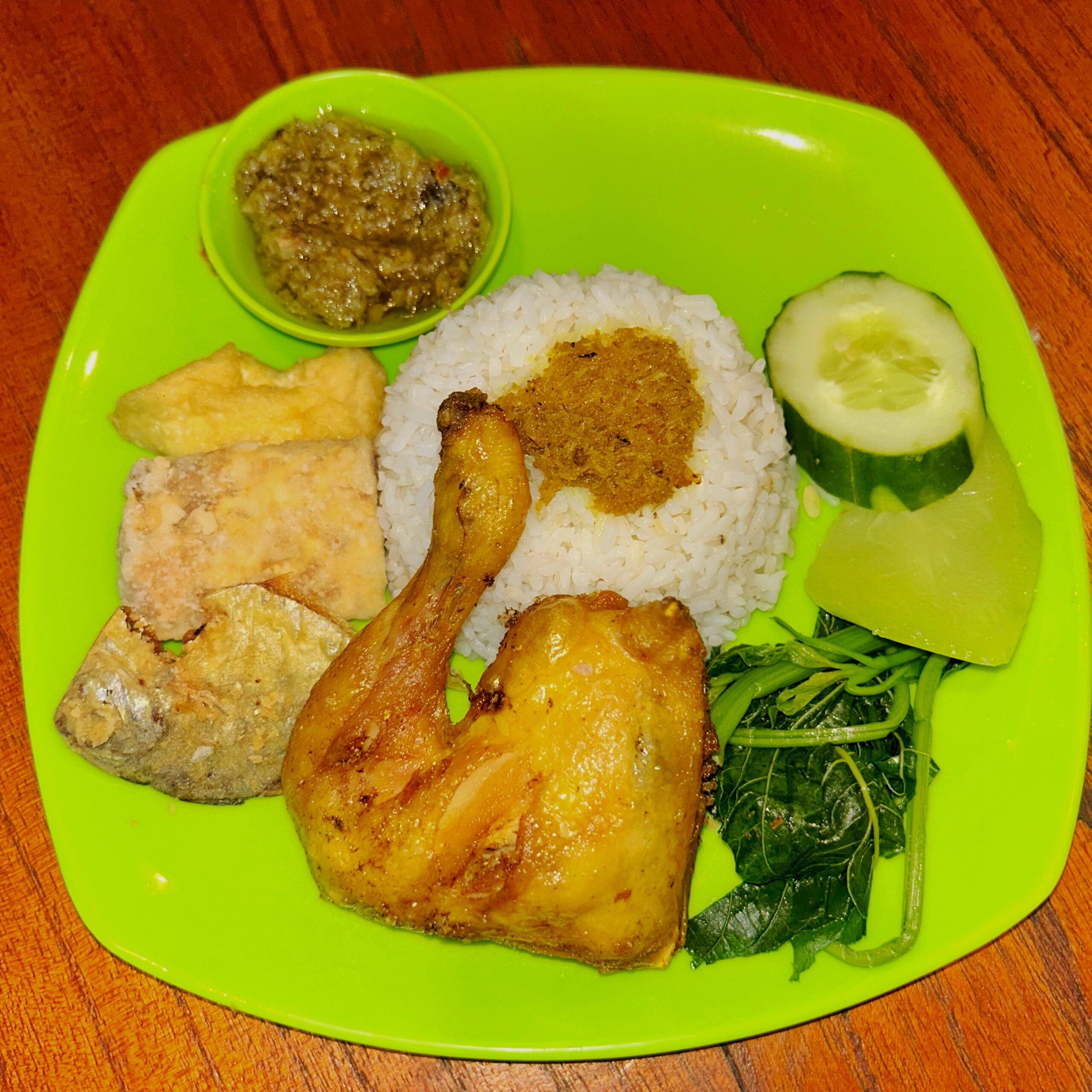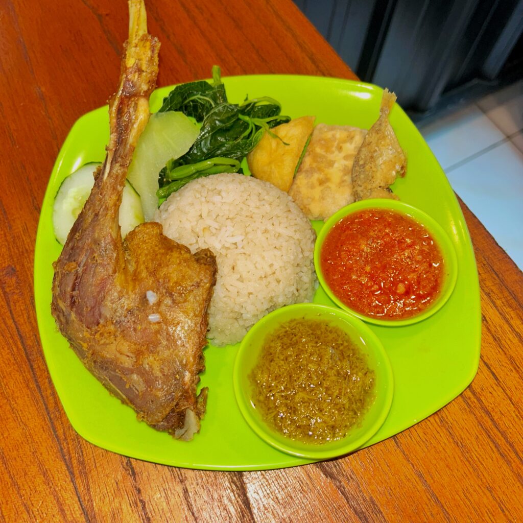 - Nasi Tempong Ayam – Rp15.000 : Paduan sederhana tapi nikmat dapatnya nasi, ayam, tempe, tahu, ikan asin, sayur, sambal ijo.