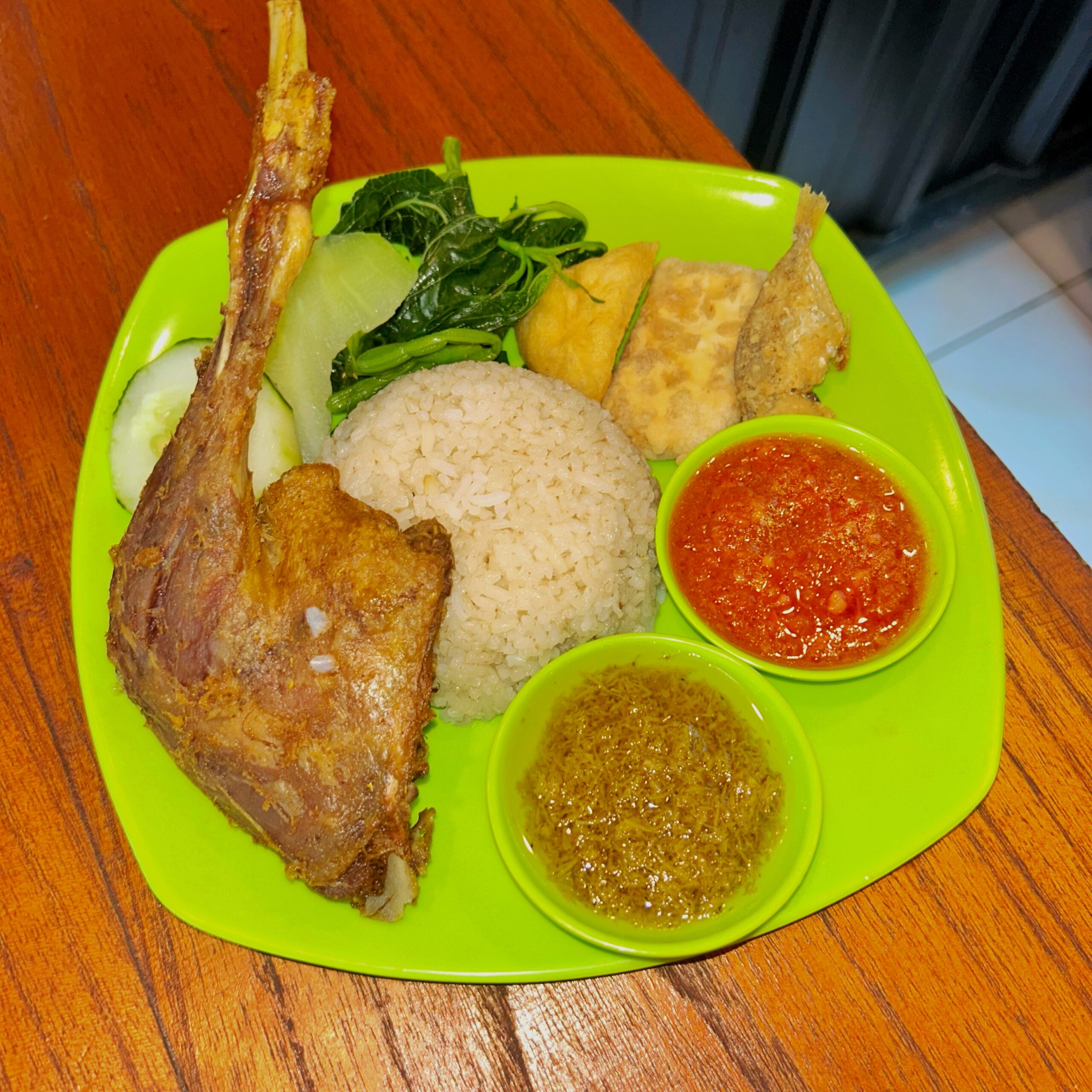 - Nasi Tempong Lele – Rp10.000 : Menu paling ekonomis, tapi tetap mantap ada lele goreng, tahu, tempe, sayur, sambal mentah.